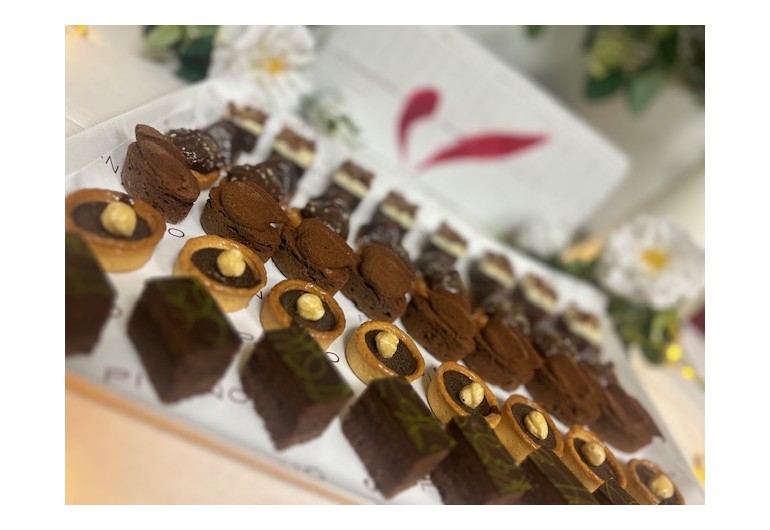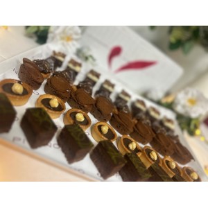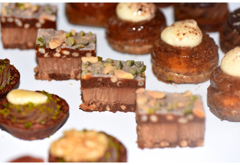 Savarins au whisky - Feuillantines riz - Mendiants Gianduja noix & pistache - Financiers griottes - Moelleux thé & ganache - Duo Gianduja amande & pistache - Carrés feuillantine chocolat café